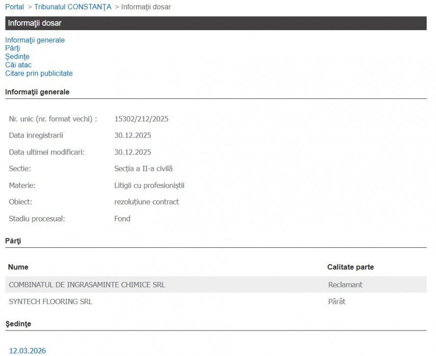 Dosarul se află înregistrat la Tribunalul Constanța cu nr. unic 15302/212/2025 și data de 30.12.2025.