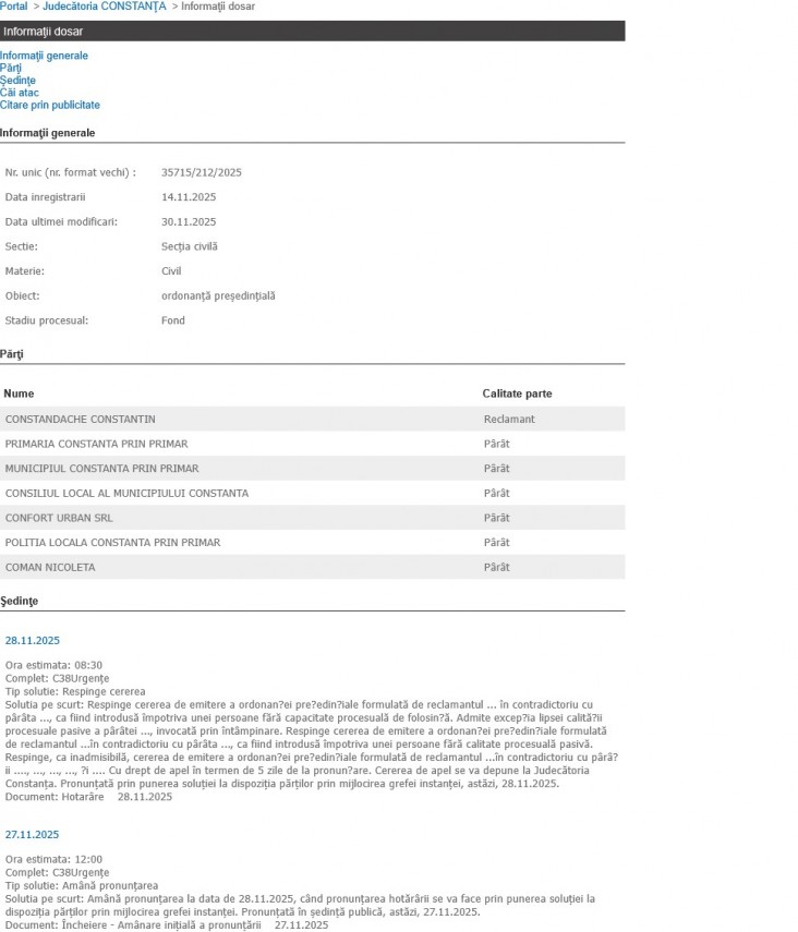 Pe 14 noiembrie a.c., reclamantul a depus cererea de chemare în judecată la Judecătoria Constanța împotriva pârâților: Primăria Constanța prin primar, municipiul Constanța prin primar, Consiliul local al municipiului Constanța, Confort Urban SRL, Poliția Locală Constanța prin primar și Coman Nicoleta.