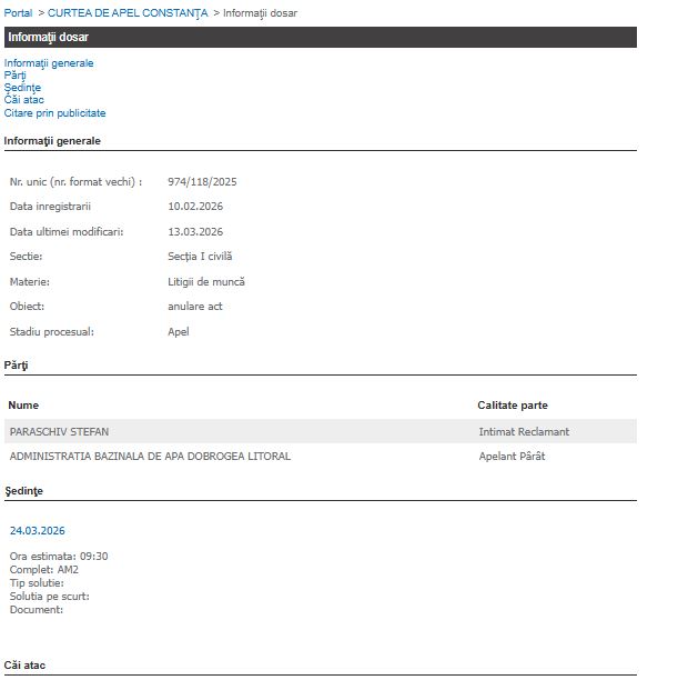 Curtea de Apel Constanța a programat pentru astăzi, 24 martie 2026, o nouă ședință în dosarul nr. 974/118/2025, în care Administrația Bazinală de Apă Dobrogea-Litoral (ABADL) are calitatea de apelant. Litigiul a fost inițiat de reclamantul Paraschiv Ștefan, obiectul dosarului fiind anularea unui act emis de instituție.