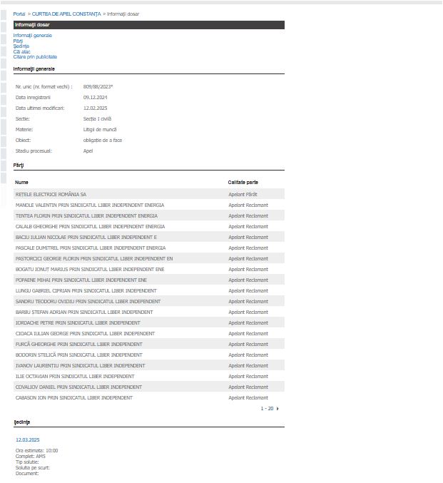 - La termenul din 12 februarie 2025, instanța a amânat cauza pentru 12 martie 2025, ora 10:00, pentru ca apelanții să prezinte dovezi privind mandatul acordat de membrii sindicatului pentru formularea apelului.