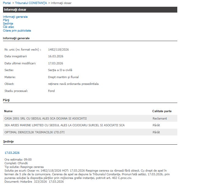Dosarul, înregistrat sub numărul 1482/118/2026, a avut ca obiect o „ordonanță președințială pentru reținere navă”. În ședința din data de 17 martie 2026, completul de judecată a respins cererea principală ca fiind rămasă fără obiect. Decizia nu este definitivă, părțile având drept de apel în termen de 5 zile de la comunicare.