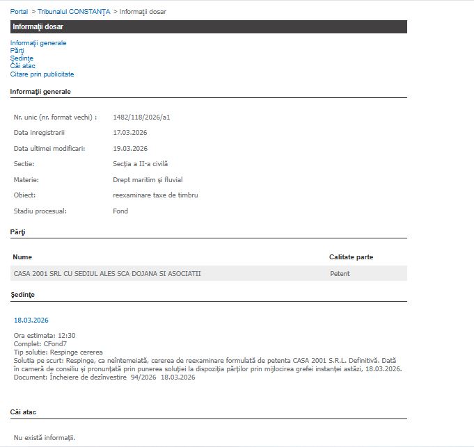În paralel, a fost soluționată și o cerere de reexaminare a taxelor de timbru (dosarul asociat 1482/118/2026/a1) depusă de aceeași societate, Casa 2001 SRL. Această solicitare a fost respinsă ca neîntemeiată de către un alt complet în data de 18 martie 2026, decizia în acest caz fiind definitivă.
