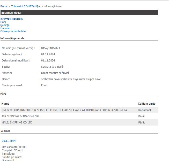 Pe data de 01.11.2024, pe rolul Tribunalului Constanța, Secţia a II-a civilă, Materie - Drept maritim şi fluvial a fost înregistrat dosarul nr. 8156/118/2024 cu obiectul - reţinere navă ordonanță presedințială. Părțile dosarului aflat în stadiul procesural de fond sunt: Enegex Shipping Fuels & Services cu sediul ales la avocat Dumitraș Florenta Salomeia – reclamant, iar ITA Shipping & Trading SRL și Halil Shipping CO LTD – pârâți.