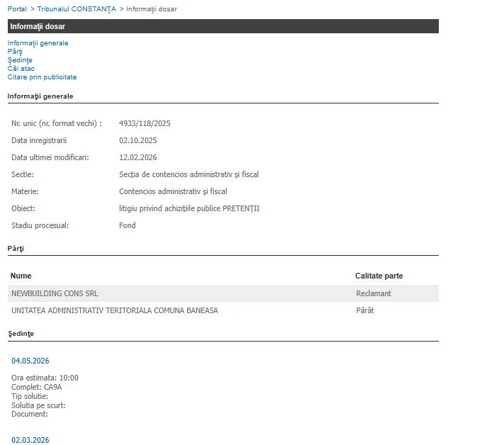 Tribunalul Constanța a decis astăzi, 12 februarie 2026, accelerarea procedurilor în dosarul în care societatea Newbuilding Cons SRL solicită pretenții financiare de la Unitatea Administrativ Teritorială (UAT) Comuna Băneasa.