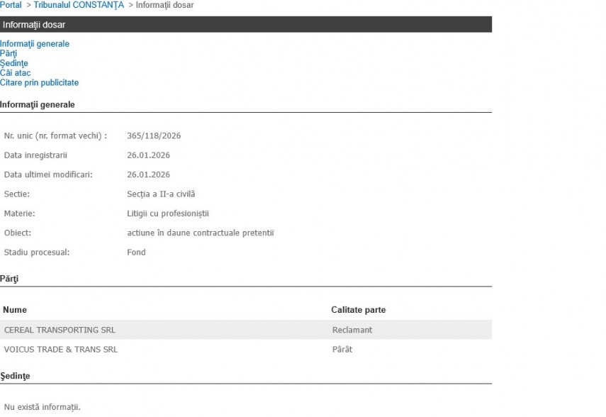 Dosarul vizează o acțiune în daune contractuale între reclamantul Cereal Transporting SRL din Cogealac, județul Constanța și Voicu’s Trade & Trans SRL din Târgu Secuiesc, județul Covasna.