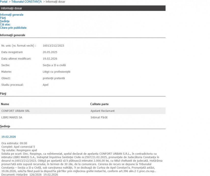 „Solutia pe scurt: Dec. Respinge, ca neîntemeiat, apelul declarat de apelanta CONFORT URBAN S.R.L., în contradictoriu cu intimata LIBRI MARIS S.A., îndreptat împotriva Sentinţei Civile nr.2507/21.02.2025, pronunţate de Judecătoria Constanţa în dosarul nr.16013/212/2023. Obligă pe apelantă să îi plătească intimatei 2.000,00 lei, cu titlul cheltuieli de judecată. Hotărârea pronunțată este supusă recursului, în termen de 30 zile, de la comunicare. Cererea de recurs se depune la Tribunalul Constanţa – Secţia a II-a Civilă, sub sancţiunea nulităţii, și se dezleagă de Curtea de Apel Constanța. Pronunţată astăzi, 19.06.2026, soluția fiind pusă la dispoziția părților prin mijlocirea grefei instanței, conform art.396 alin.2 C.proc.civ.rep..