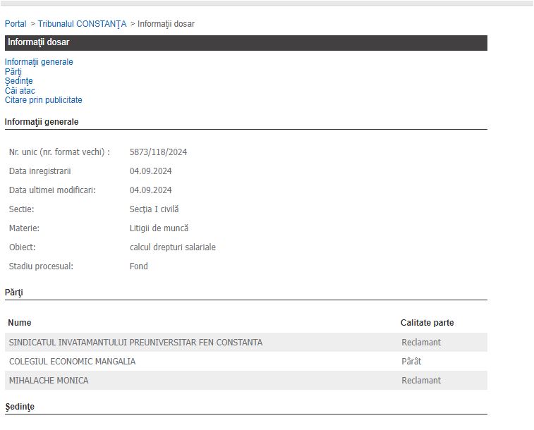 Dosarul cu indicativul 5873/118/2024 și obiectul - calcul drepturi salariale are ca părți Sindicatul Învățământului Preuniversitar FEN și Mihalache Monica Constanta – reclamanți, iar Colegiul Economic Mangalia – pârât.