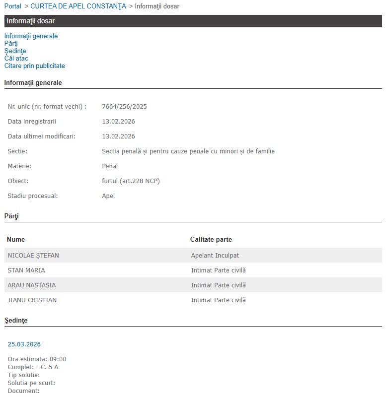 Drept urmare, Nicolae Ștefan a fost deferit justiției într-un dosar de furt calificat, iar la data de 15 ianuarie 2026 Judecătoria Medgidia l-a condamnat la 4 anio și 8 luni de închisoare.