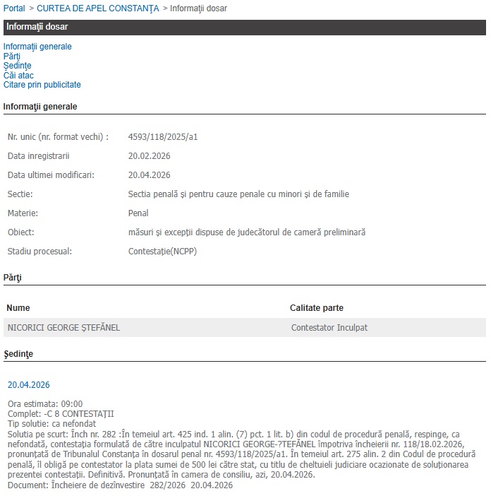 Dosarul (4593/118/2025) a fost înregistrat pe rolul Secției Penale a Tribunalului Constanța. George Ștefănel Nicorici se află în prezent în stare de arest preventiv, măsură menținută de judecători, iar la data de 18 februarie, anul în curs, instanța de fond, respectiv Tribunalul Constanța, a hotărât începerea judecății.