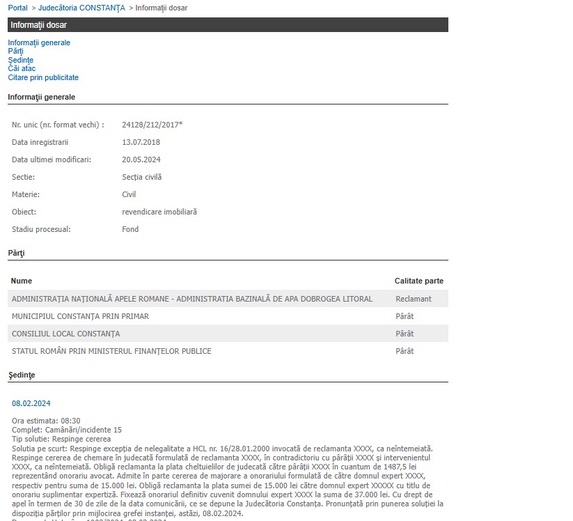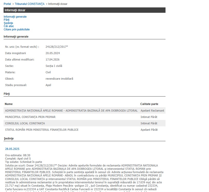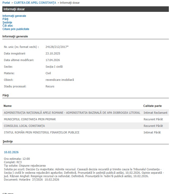 În prezent, dosarul a fost reînregistrat pe rolul Tribunalului Constanța (secția I Civilă) la data de 17 aprilie 2026.
