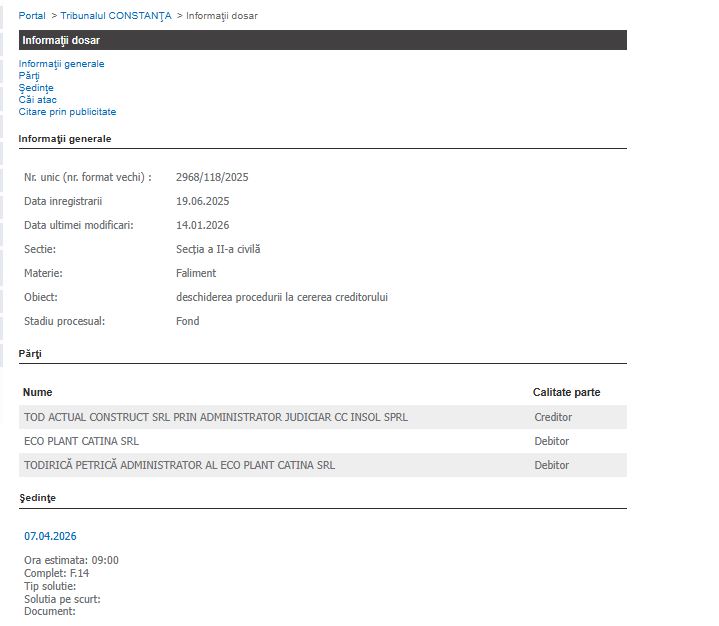 Firma Eco Plant Cătina SRL, specializată în cultivarea de cătină, se află într-o situație financiară critică. La data de 19 iunie 2025 a fost înregistrat un dosar la Tribunalul Constanța, Secția a II-a civilă, având ca obiect deschiderea procedurii de faliment la cererea creditorului Tod Actual Construct SRL, prin administrator judiciar CC Insol SPRL.