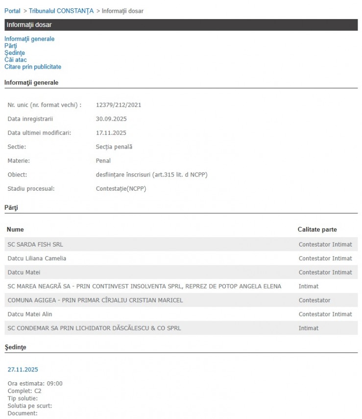 Mai precis, este vorba despre dosarul cu indicativul 12379/212/2021, înregistrat pe rolul Secției Penale a Tribunalului Constanța, aflat în faza contestației. Cauza are ca obiect „desființare înscrisuri”, potrivit art. 315 lit. d din Codul de procedură penală, și vizează anularea mai multor documente considerate falsificate sau neautentice în legătură cu tranzacții comerciale și imobiliare derulate în zona Agigea.