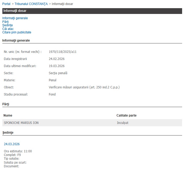 Marius Sponoche a fost citat astăzi, 24.03.2026, la Tribunalul Constanța! Mai precis, fostul manager al Spitalului Orășenesc Cernavodă, cercetat într-un dosar penal de corupție, a fost chemat în fața instanței pentru verificarea măsurilor asiguratorii.