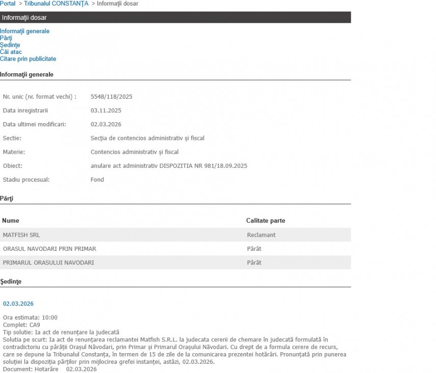 Astăzi, 2 martie 2026, Tribunalul Constanța s-a pronunțat în procesul dintre Matfish SRL, primarul orașului Năvodari și orașul Năvodari prin primar.