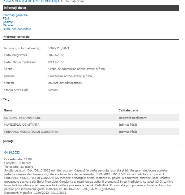 Pe data de 4 octombrie 2022, Curtea de Apel Constanța, Secția de contencios administrativ și fiscal, a admis recursul formulat de societatea SC Silva Prodimpex SRL împotriva sentinței date la fond de Tribunalul Constanța.