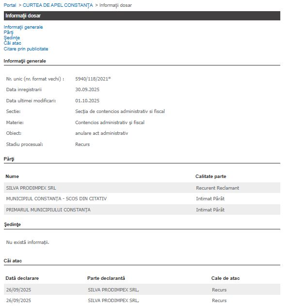 Un litigiu administrativ (dosar 5940/118/2021*), privind cererea firmei SC Silva Prodimpex SRL de anulare a unui act administrativ emis de administrația locală, a primit o soluție de casare parțială la Curtea de Apel Constanța.