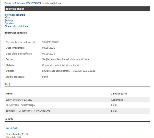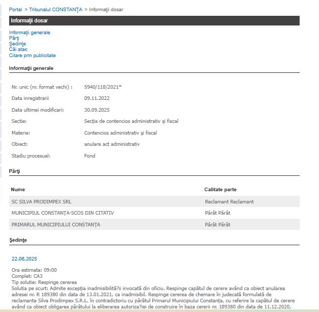 Amintim că la data de 4 aprilie 2022, a fost înregistrat dosarul cu numărul 2313/118/2022, pe secția de contencios administrativ și fical, fără să fie înregistrat încă un prim termen. Părți în dosar sunt Silva Prodimpex SRL, cu sediul ales la SCA Apostol Armeanu și Cristiana Grecu, în calitate de reclamant și Primarul Municipiului Constanța, în calitate de pârât. Obiectul chemării în instanță constă în anularea unui certificat de urbanism – CU 3014/04.10.2021.