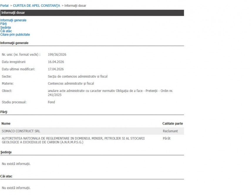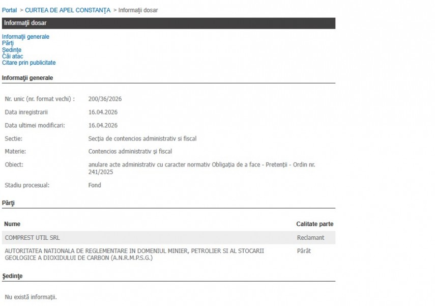 Primul dosar, cu indicativul 200/36/2026, a fost înregistrat la data de 16.04.2026, pe rolul Curții de Apel Constanța, la Secţia de contencios administrativ și fiscal.