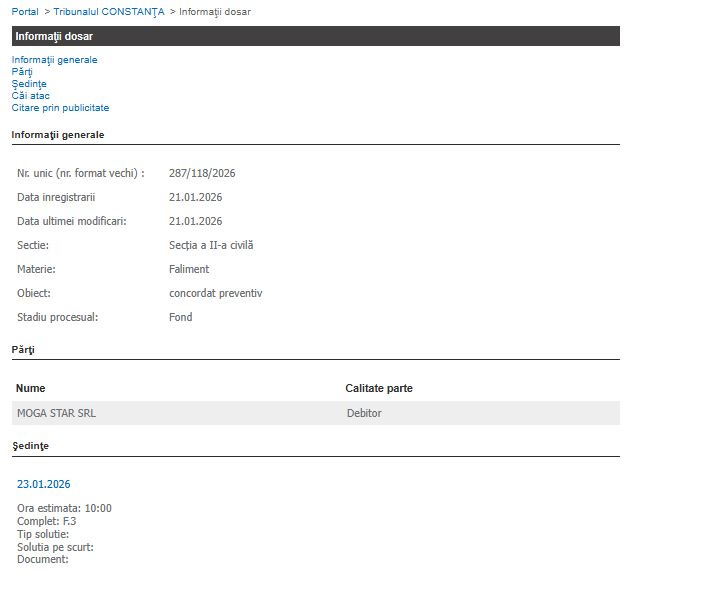Societatea Moga Star SRL a depus la Tribunalul Constanța o cerere de deschidere a procedurii de concordat preventiv, în încercarea de a evita insolvența și de a-și redresa activitatea economică.