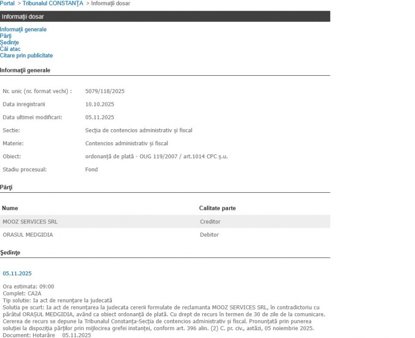 Astăzi, 5 noiembrie 2025, Tribunalul Constanța a judecat cauza în care Mooz Services SRL a chemat în instanță Primăria Medgidia pe „ordonanță de plată”.