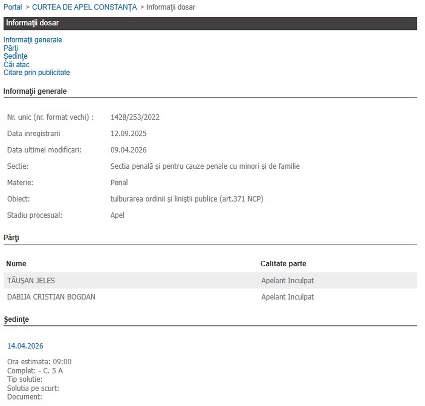 - Curtea de Apel Constanța va da sentința definitivă în cazul a doi bărbați suspectați că ar fi semănat panică la un botez și ar fi distrus două autoturisme, după ce ar fi fost alungați de la eveniment.