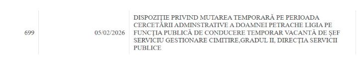 Dispoziția 699 din 05/02/2026 este dispoziţia privind mutarea temporara pe perioada cercetarii adminstrative a doamnei Petrache Ligia pe funcţia publică de conducere temporar vacantă de şef serviciu gestionare cimitire, gradul II, Direcţia Servicii Publice.