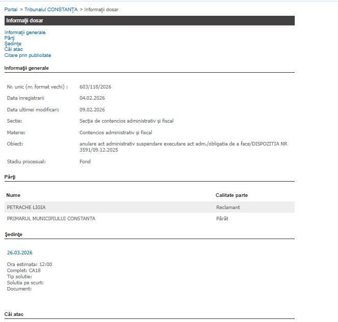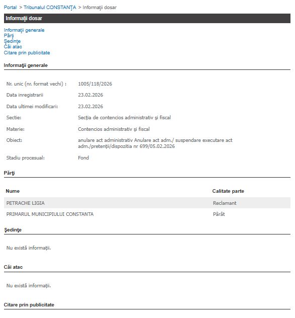 Conform datelor oficiale din portalul instanțelor, dosarul cu numărul 1005/118/2026 a fost înregistrat pe data de 23 februarie 2026. Miza procesului este reprezentată de Dispoziția nr. 699, emisă pe 5 februarie 2026. Pe lângă cererea de anulare, acțiunea vizează și suspendarea executării respectivului act administrativ, precum și solicitarea unor pretenții materiale.
