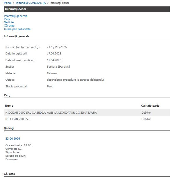 Societatea Nicodan 2000 SRL din Constanța, a depus oficial solicitarea de deschidere a procedurii de insolvență, dosarul fiind înregistrat pe data de 17 aprilie 2026.