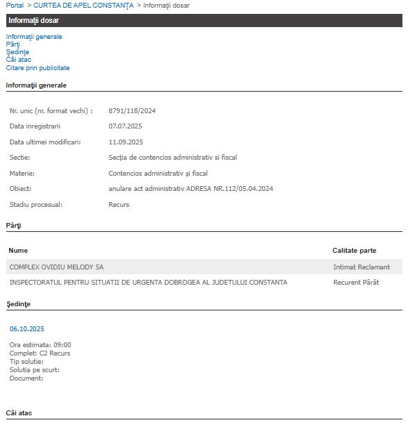 Hotărârea Tribunalului Constanța nu este încă definitivă. ISU Dobrogea a declarat recurs pe 27 iunie 2025 și, ulterior, pe 2 iulie 2025. Ca urmare a recursurilor, dosarul a fost înregistrat la Curtea de Apel Constanța pe 7 iulie 2025, trecând în stadiul procesual de recurs. Complex Ovidiu Melody SA are acum calitatea de intimat reclamant, iar ISU Dobrogea este recurent pârât.