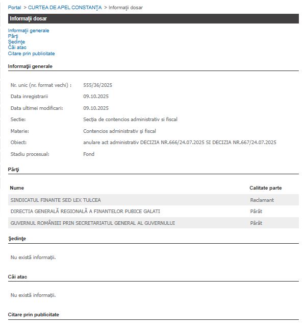 Sindicatul Finanțe Sed Lex Tulcea a depus o acțiune în instanță împotriva Direcției Generale Regionale a Finanțelor Publice Galați și a Guvernului României, prin Secretariatul General al Guvernului, solicitând anularea a două decizii administrative emise în data de 24 iulie 2025, respectiv Decizia nr. 666 și Decizia nr. 667.