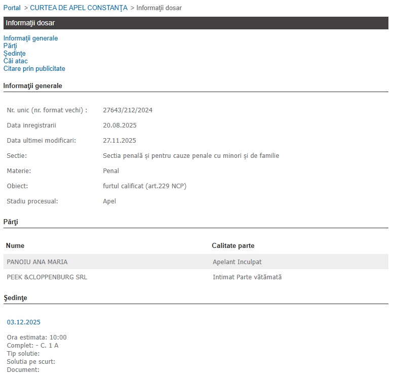Soluția a fost contestată de către inculpată, fapt pentru care cauza va fi soluționată la Curtea de Apel Constanța. Potrivit Portalului Instanțelor de Judecată, ultimul termen în cauză a avut loc miercuri, 03.12.2025.