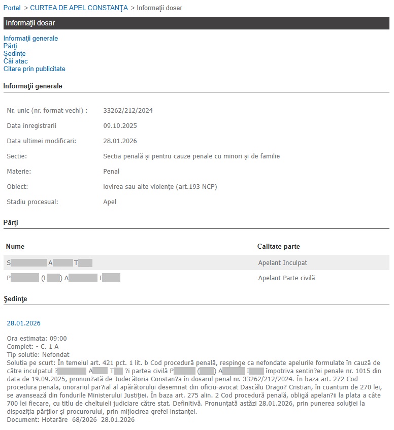 După ce Judecătoria Constanța a anunțat prima condamnare, iar soluția a fost contestată de inculpat și de partea vătămată, cauza a fost înaintată instanței superioare, care astăzi, 28.01.2026, a anunțat decizia definitivă!