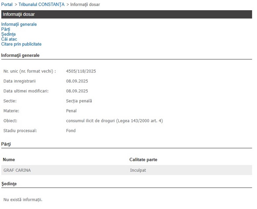 Cea vizată în cauză se numește Graf Carina și a fost deferită justiției după ce ar fi fost prinsă cu droguri de mare risc, respectiv cocaină, la un festival din Constanța.