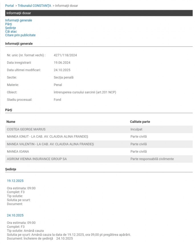 Potrivit Portalului Instanțelor de Judecată, procesul de fond se desfășoară pe rolul Tribunalului Constanța, având ca obiect infracțiunea de întrerupere ilegală a cursului sarcinii, prevăzută de art. 201 alin. (1) lit. c) și alin. (3) din Codul Penal.