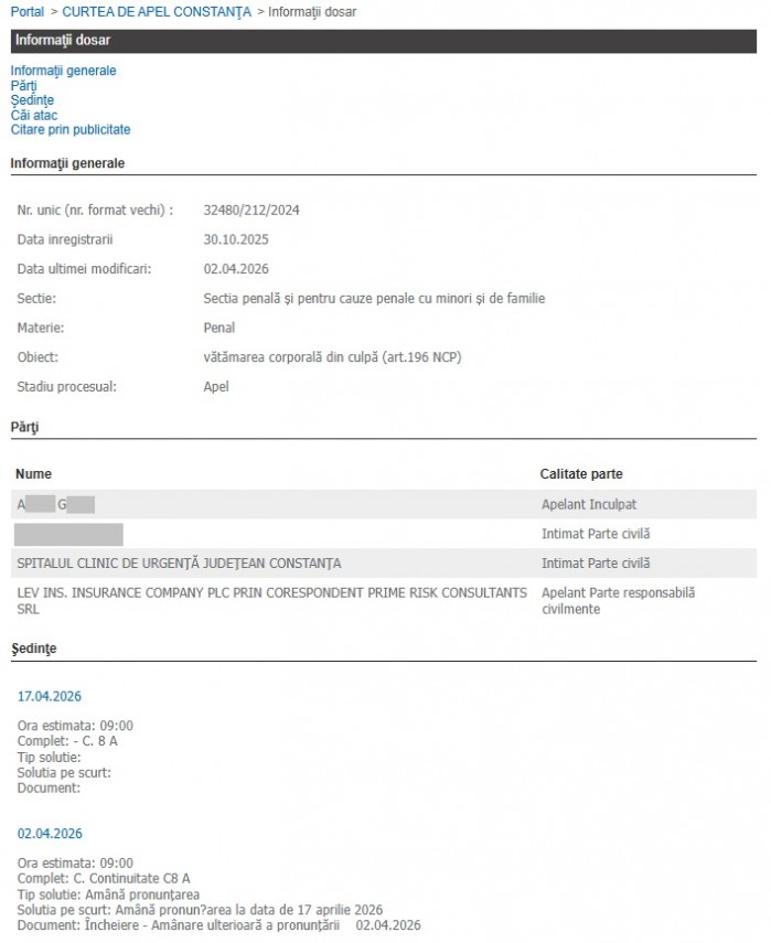 Curtea de Apel Constanța este așteptată să se pronunțe astăzi, 17.04.2026, în dosarul unui accident petrecut în urmă cu mai bine de doi ani, în care o femeie s-a ales cu răni grave, după ce ar fi fost lovită de o mașină. Aceasta le-a spus anchetatorilor că a fost accidentată în timp ce se deplasa spre cimitir.