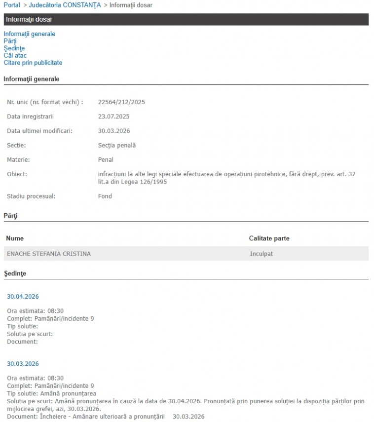 Astfel, în dosarul cu indicativul 22564/212/2025, pe fond a avut loc o ședință de judecată, iar apoi magistrații au rămas în pronunțare. Pronunțarea a fost amânată de două ori, ultimul termen fiind stabilit pentru data de 30 aprilie 2026.