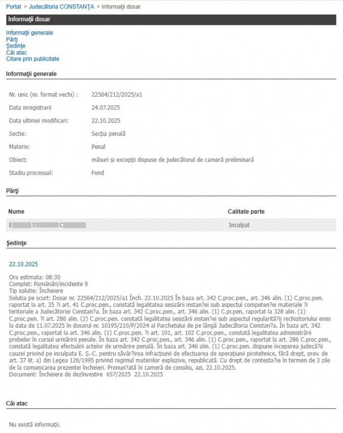 La data de 22.10.2025, judecătorul Camerei Preliminare a Judecătoriei Constanța a validat rechizitoriul, însă potrivit Potalului Instanțelor de Judecată, măsura nu ar fi fost contestată fapt pentru care ar putea fi demarată judecata în cauză.
