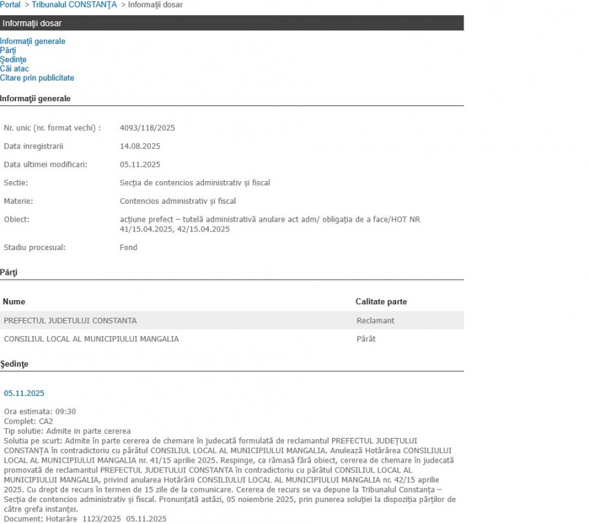 Adrian Picoiu, prefectul județului Constanța, a chemat în judecată Consiliul Local al Municipiului Mangalia, cererea fiind înregistrată pe rolul Tribunalului Constanța la data de 14 august 2025.