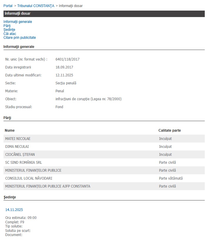 Tribunalul Constanța a amânat din nou pronunțarea astăzi, 12.11.2025, în dosarul în care fostul edil din Năvodari Matei Nicolae a fost deferit justiției de către DNA, sub acuzația de abuz în serviciu și conflict de interese.