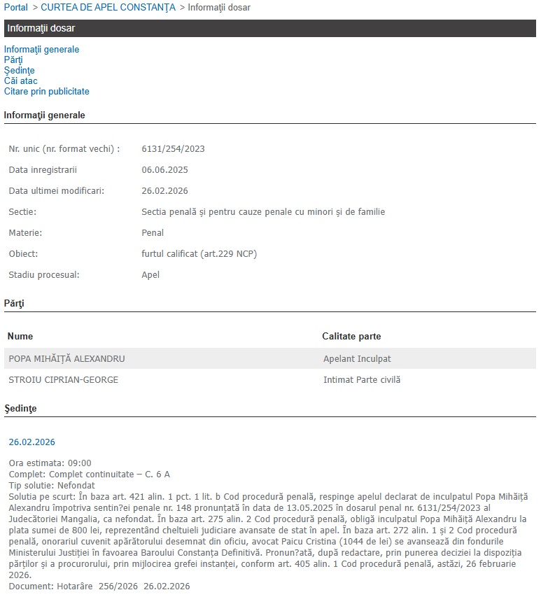 Soluția instanței de fond a fost contestată de inculpat, fapt pentru care soluționarea cauzei a revenit în sarcina Curții de Apel Constanța, instanță care, potrivit Portalului Instanțelor de judecată, joi, 26.02.2026, a respins contestația.