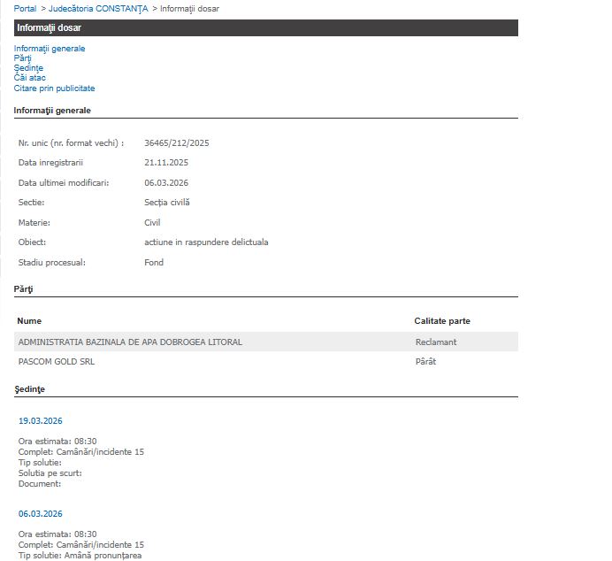 Judecătoria Constanța a decis, în ședința din 6 martie 2026, o nouă amânare a pronunțării în dosarul nr. 36465/212/2025, în care Administrația Bazinală de Apă Dobrogea Litoral (ABADL) solicită tragerea la răspundere a societății Pascom Gold SRL.