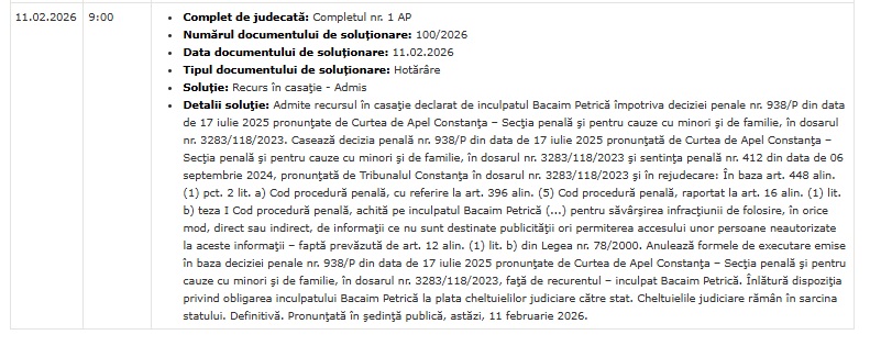 Recursul în casație a fost formulat de către Petrică Bacaim, după ce, în luna iulie a anului trecut, Curtea de Apel Constanța l-a condamnat la 1 an de închisoare cu suspendare, sub termen de supraveghere de 2 ani,
