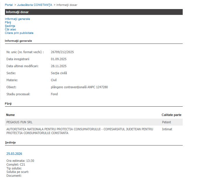 Pegasus Fun SRL din Constanța contestă o amendă ANPC. Termen în martie 2026