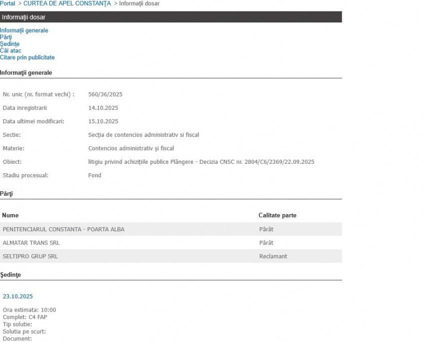 Pe data de 14 octombrie 2025, Curtea de Apel Constanța a înregistrat dosarul cu indicativul 560/36/2025, al cărui litigiu este reprezentat de achizițiile publice.