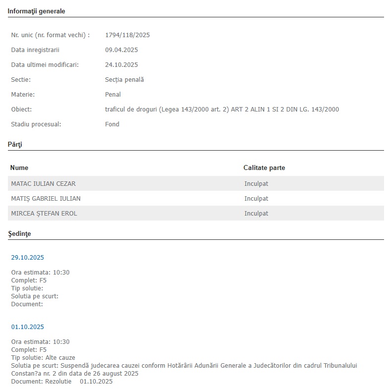 În cauză, este vorba despre cauza care îi vizează pe inculpații Matac Iulian Cezar, Matiş Gabriel Iulian și Mircea Ştefan Erol, care, potrivit portalului instanțelor de judecată, a fost suspendată la data de 1 octombrie, anul curent. Astfel, la finalul acestei luni, cei trei vor ajunge din nou în atenția magistraților.