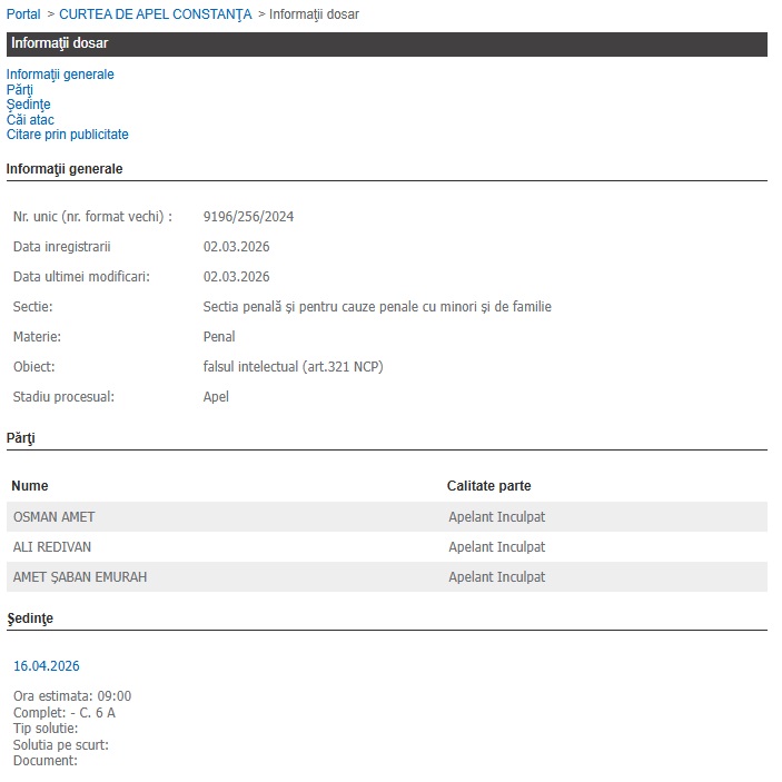În cauza cu indicativul 9196/256/2024, judecată pe fond, cei trei inculpați sunt Osman Amet, Ali Redivan, Amet Șaban Emurah, toți acuzați că s-ar fi folosit de ștampila unei PFA, ar fi emis în fals certificate de distrugere pentru mai multe autoturisme și autoutilitare scoase din uz, în vederea utilizării acestora de către proprietari, pentru radierea din evidențele fiscale și din circulație.
