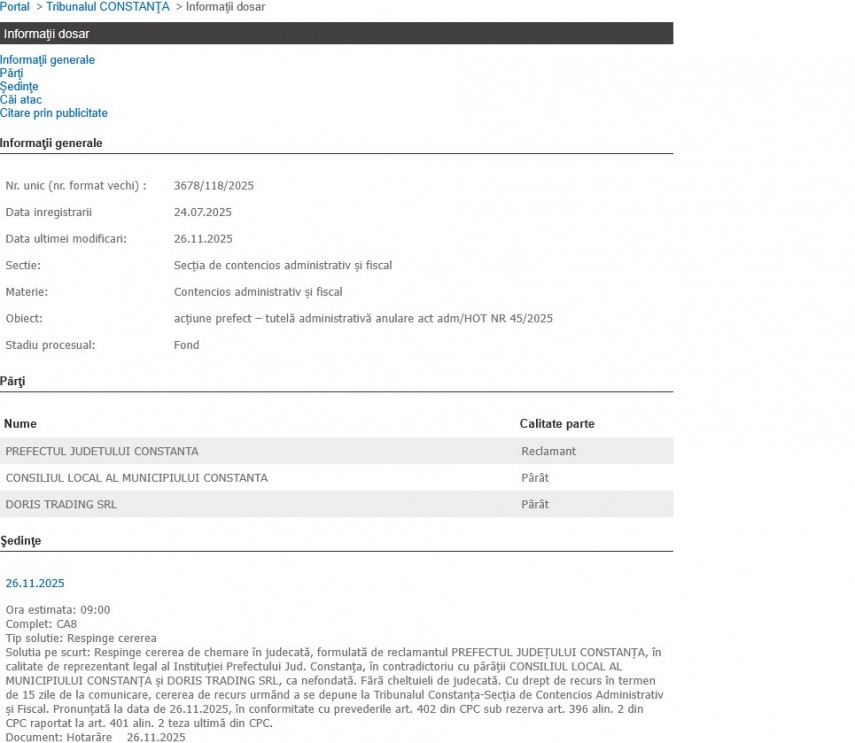 „Solutia pe scurt: Respinge cererea de chemare în judecată, formulată de reclamantul PREFECTUL JUDEŢULUI CONSTANŢA, în calitate de reprezentant legal al Instituţiei Prefectului Jud. Constanţa, în contradictoriu cu pârâţii CONSILIUL LOCAL AL MUNICIPIULUI CONSTANŢA şi DORIS TRADING SRL, ca nefondată. Fără cheltuieli de judecată. Cu drept de recurs în termen de 15 zile de la comunicare, cererea de recurs urmând a se depune la Tribunalul Constanţa-Secţia de Contencios Administrativ şi Fiscal. Pronunţată la data de 26.11.2025, în conformitate cu prevederile art. 402 din CPC sub rezerva art. 396 alin. 2 din CPC raportat la art. 401 alin. 2 teza ultimă din CPC.