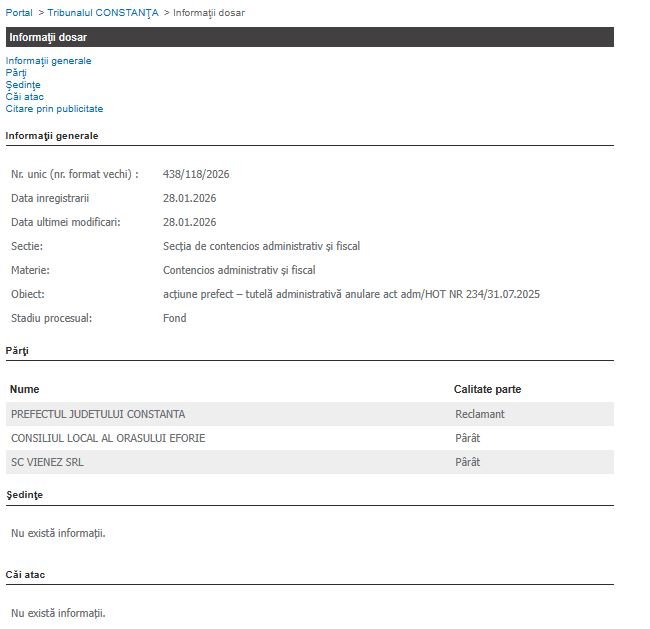 Obiectul dosarului 438/118/2026 este anularea Hotărârii nr. 234 din 31.07.2025. În acest litigiu, alături de Consiliul Local Eforie, apare în calitate de pârât și societatea comercială SC Vienez SRL.