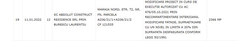 Este vorba despre un certificat de urbanism emis de Primăria Năvodari la începutul anului 2022 pentru o investiție în zona Mamaia Nord. Documentul vizează modificarea unui proiect aflat deja în execuție pe strada T2, aparținând societății Absolut Construct Residence SRL.