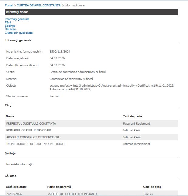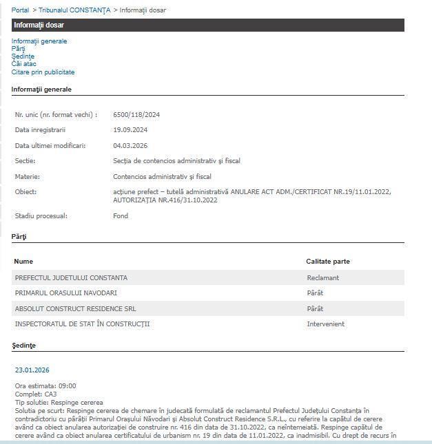 Amintim că, pe rolul Tribunalului Constanța a fost înregistrat dosarul 6500/118/2024 în data de 19 septembrie 2024, unde Absolut Construct Residence SRL este chemată în judecată Prefectul Județului Constanța pentru anularea unei autorizații de construire din Năvodari.